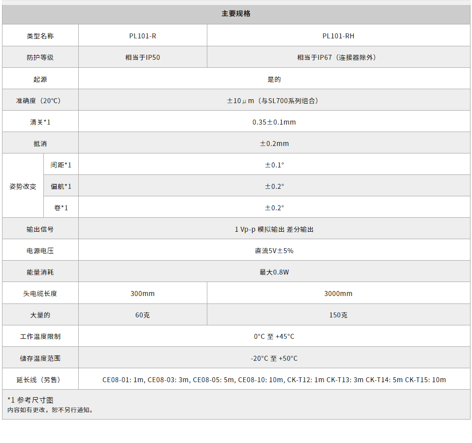 产品简介: PL101与SL700组合,检测直线位置和移动距离,并输出模拟信号。也可与 MJ500/600 系列组合输出 A/B 相信号。非接触式测量头和秤由于采用磁性检测方式,耐污垢、油污等,抗振动、冲击能力强。可根据应用选择各种类型