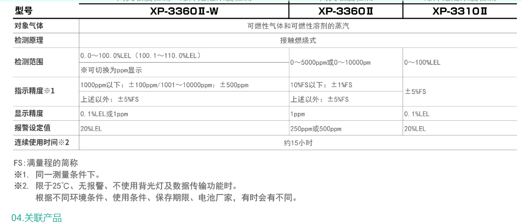 能够在低浓度(0~5000/0~10000ppm)和爆炸危险浓度(0~100%LEL)之间切换检测的XP-3360Ⅱ-W用于低浓度检测的XP-3360Ⅱ用于爆炸危险浓度检测的XP-3310Ⅱ