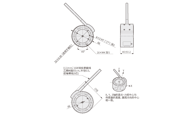 | 其他 | 额定输出、非线性、滞后、干涉度均为在力矩中心施加载荷时的校准值。 *为了安装状态下的6个分力都达到±1500mV的额定输出,安装过程中的紧固影响和由安装带来的负载产生的零点漂移应在±200mV以内。 |