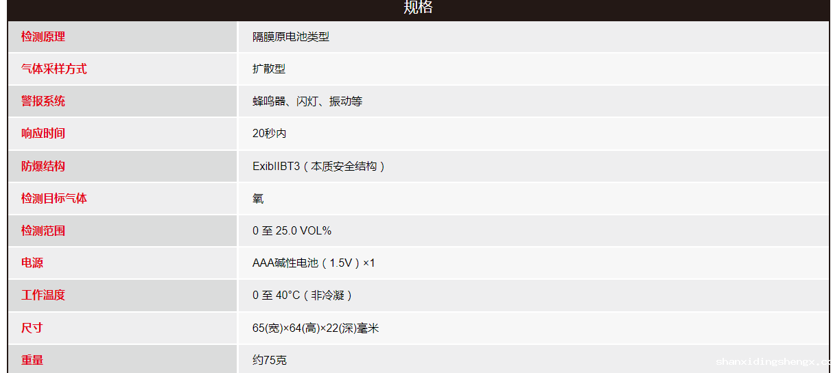 通过 4 路指示灯、蜂鸣器和振动提醒您配备峰值记忆功能和峰值保持功能一节 AAA 碱性电池可连续使用约 5,000 小时规格检测原理隔膜原电池类型气体采样方式扩散型警报系统蜂鸣器、闪灯、振动等响应时间20秒内防爆结构ExibIIBT3(质安全结构)检测目标气体氧温度0 至 40°C(非冷凝)尺寸65(宽)×64(高)×22(深)毫米重量约75克