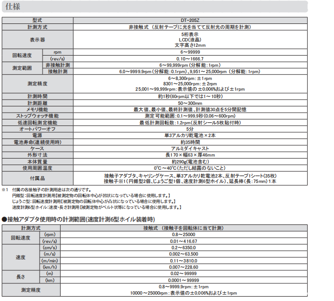 紧凑型设计的非接触式和接触式转速计特征: 分频功能允许测量高达 1.2 rpm(通过粘贴 2 至 5 块反光带进行测量) - LED 光源实现节能(35 小时连续测量{2 节 AA 碱性电池}) - 外壳由轻质耐用的铝模制成-铸件模型 DT-205Z测量方法 非接触式(用光照射反光带来测量反射光的周期)/接触式(通过接触旋转体来测量)