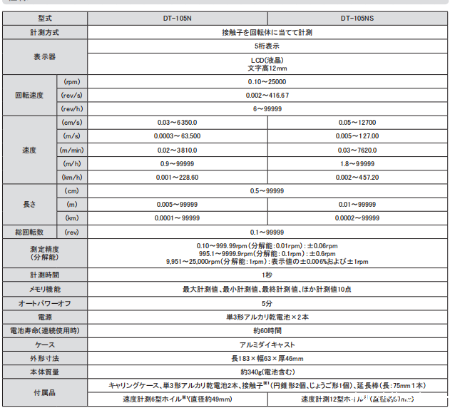 特征: 在 0.1 至 25,000 rpm 的低速下测量,而不改变量程。 - 内存、小、终测量值和其他 10 个数据点。 - LCD(液晶)显示大数字和单位。 - 由 2 节 AA 供电碱性电池,节能设计,可连续测量约60小时
