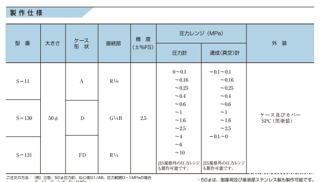 产品简介: 该压力表是根据 JIS B 7505-1 波登管压力表制造的,用于恒定压力。 特征 ○体积小。 ○价格低廉。