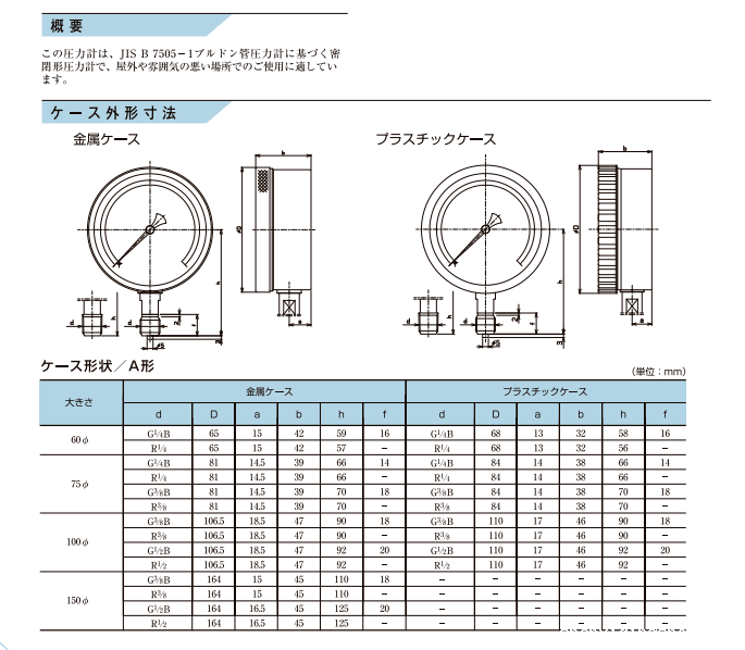 产品简介: 该压力表是基于JIS B 7505-1波登管压力表的封闭式压力表,适合在户外或气氛较差的地方使用。