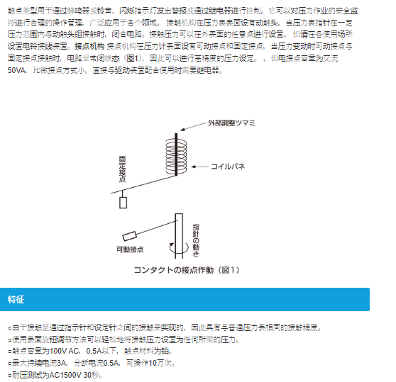 由于接触是通过指示针和设定针之间的接触来实现的,因此具有与普通压力表相同的接触精度。使用表面旋钮调节方法可以轻松地将接触压力设置为任何所需的压力。触点容量为100V AC,0.5A以下,触点材料为铂。