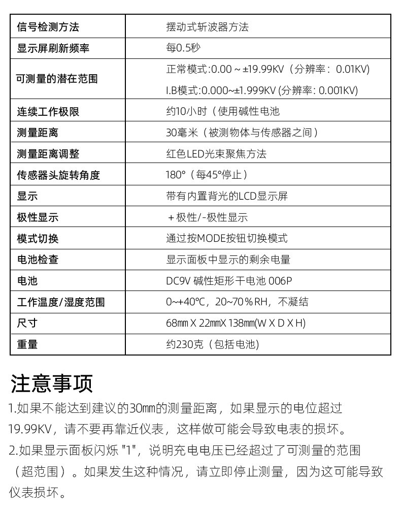 本款静电场仪是一种带有数字读数的便携式静电场仪,用于测量带电物体的电动势。在测量波动的静电时,可以暂时保持一个指示值,并在MAX模式下检查电压。特点可见的明亮LED窗口采用单按钮控制,操作简便●有两种模式可供选择:正常和操作模式传感器头损坏时会有错误指示有零点调整开关,可使电表恢复到零伏测量范围为0-19.999KV可选择电荷板来检查电离器的离子平衡(P/N ODZ4-PLT)可选择测量人体静电的平板(P/N ODZ4-HPLT)标配180度旋转传感器头,可以在各种角度进行测量传感器头和带电物体之间的距离应该是1英寸远