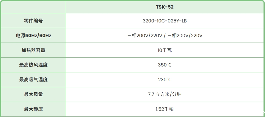 产品简介: TSK-52 零件编号 3200-10C-025Y-LB 电源50Hz/60Hz 三相200V/220V / 三相200V/220V 加热器容量 10千瓦 最高热风温度 350℃ 最高吸气温度 230℃ 最大风量 7.7 立方米/分钟 最大静压 1.52千帕