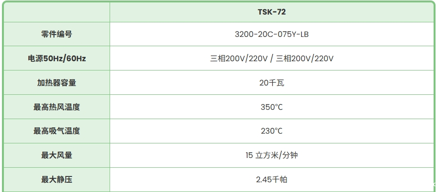 产品简介: TSK-72 零件编号 3200-20C-075Y-LB 电源50Hz/60Hz 三相200V/220V / 三相200V/220V 加热器容量 20千瓦 最高热风温度 350℃ 最高吸气温度 230℃ 最大风量 15 立方米/分钟 最大静压 2.45千帕