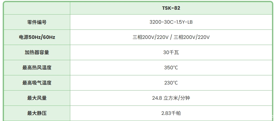 产品简介: TSK-82 零件编号 3200-30C-1.5Y-LB 电源50Hz/60Hz 三相200V/220V / 三相200V/220V 加热器容量 30千瓦 最高热风温度 350℃ 最高吸气温度 230℃ 最大风量 24.8 立方米/分钟 最大静压 2.83千帕