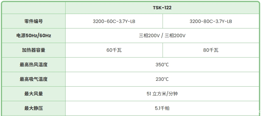 产品简介: TSK-122 零件编号 3200-60C-3.7Y-LB 3200-80C-3.7Y-LB 电源50Hz/60Hz 三相200V / 三相200V 加热器容量 60千瓦 80千瓦 最高热风温度 350℃ 最高吸气温度 230℃ 最大风量 51 立方米/分钟 最大静压 5.1千帕