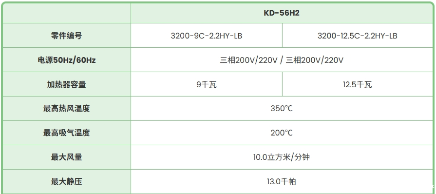 产品简介: KD-56H2 零件编号 3200-9C-2.2HY-LB 3200-12.5C-2.2HY-LB 电源50Hz/60Hz 三相200V/220V / 三相200V/220V 加热器容量 9千瓦 12.5千瓦 最高热风温度 350℃ 最高吸气温度 200℃ 最大风量 10.0立方米/分钟 最大静压 13.0千帕
