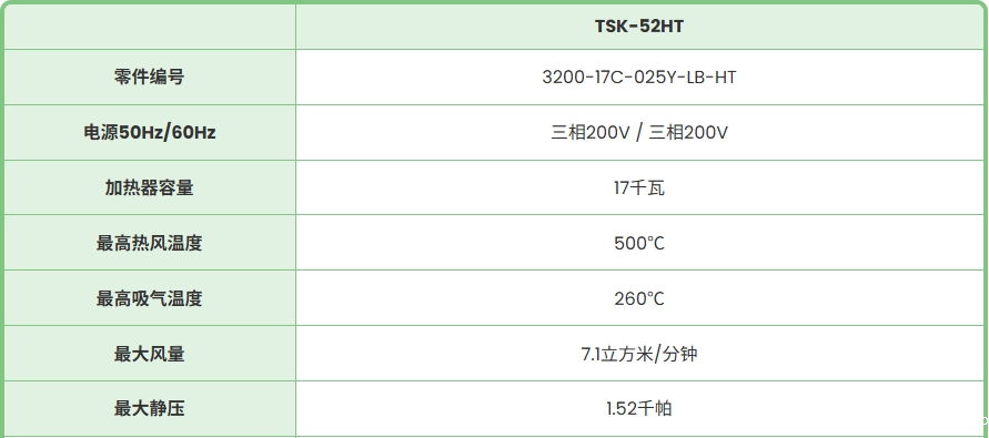 产品简介: TSK-52HT 零件编号 3200-17C-025Y-LB-HT 电源50Hz/60Hz 三相200V / 三相200V 加热器容量 17千瓦 最高热风温度 500℃ 最高吸气温度 260℃ 最大风量 7.1立方米/分钟 最大静压 1.52千帕